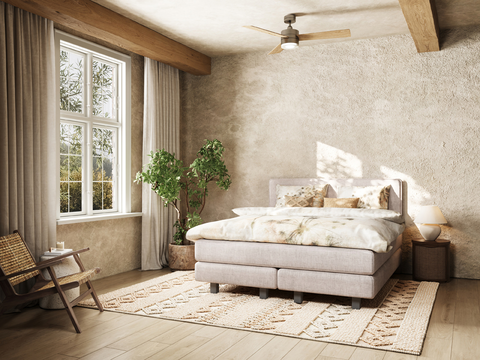 De keerbare Mette matras – verkrijgbaar in soft, medium, firm en extra firm – combineert natuurlijke ventilatie met puntelasticiteit. De set wordt verfijnd met de Visby topmatras, voorzien van 6 cm hoogwaardig natuurlatex voor een zacht, luxueus ligcomfort.